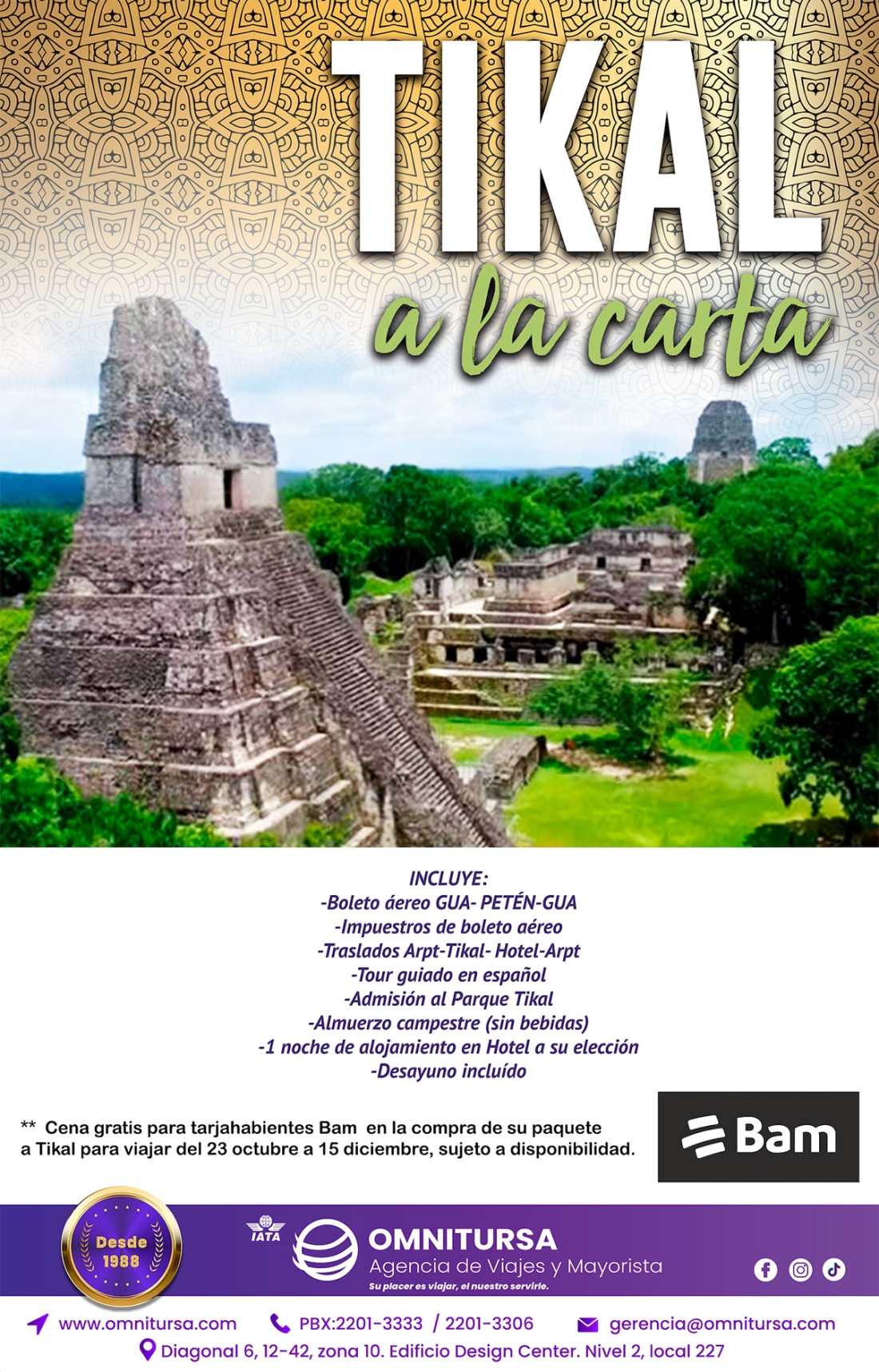 Nuestro programa "Tikal a la Carta" en nuestro programa que ofrece la oportunidad de visitar uno de los sitios turísticos arqueológicos más importantes de la cultura Maya.