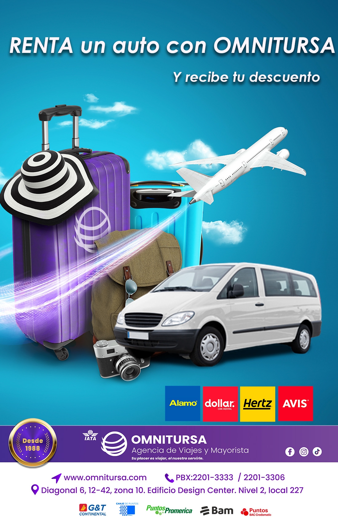 En la renta de un vehículo con OMNITURSA recibirás un descuento, paga en quetzales desde Guatemala, reserva GARANTIZADA y puedes pagar con PUNTOS BAC, PUNTOS PROMERICA, PUNTOS BAM y PUNTOS Y MILLAS G&T